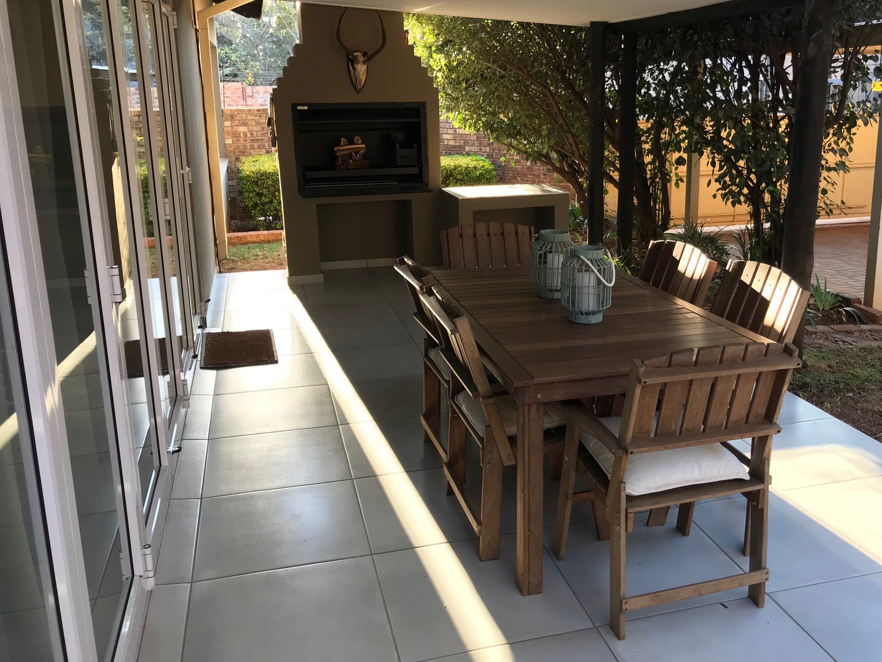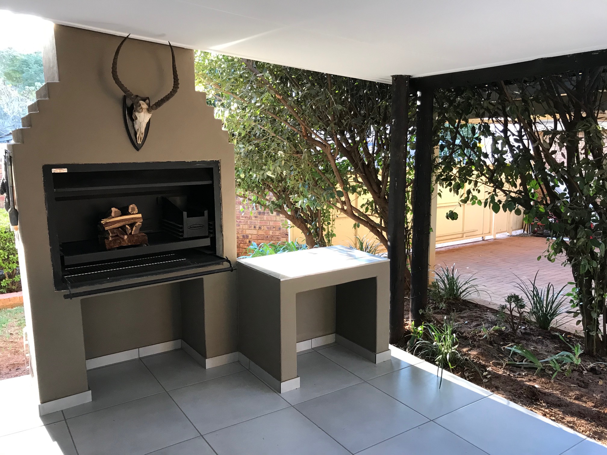 The living area leads out to a spacious patio with built in braai. Good quality bushveld wood is for sale at the premises.